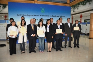 会议是以“绿色农药”为主题的国际学术研讨会。研讨农药发现、农药生物技术和剂型、农药与环境等议题。内容包括分子设计、生物信息学、农药合成、具有农药活性天然产物及合成、农药分子生物学、农药毒理学及剂型加工新技术、农药安全使用和环境影响等。大会邀请了先正达公司的John Clough博士、韩国毒理研究所Yong-Hwa Kim博士、上海交通大学的邓子新院士、日本农药学会会长筑波大学教授Hiroshi Matsumoto做了特邀报告。大会设立了三个分会场,还分别邀请了日本、韩国、中国的学者做了18个邀请报告,19个墙报口头报告。大会收到会议摘要78篇,参会的墙报共有88篇。大会还根据三个分会场分别设立了墙报金奖、银奖和铜奖,由德国BASF公司赞助,由日本德高望重的Izuru yamamoto教授等为优秀墙报获得者颁发了优秀Poster证书及奖金。