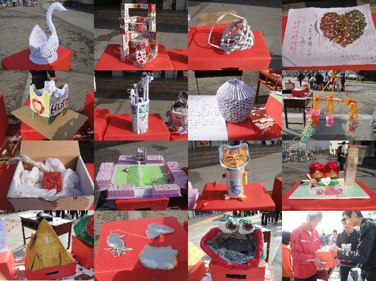 学生们不忘灾区贫困人民,为送上自己的一份爱心而纷纷行动起来。学生们以爱心、环保等为主题,开展了一次独具匠心的创意募捐活动。所谓创意募捐,就是鼓励学生们,用身边的废旧材料创作出精美的公益作品进行展示,观众们将小零钱作为选票,为自己最喜爱的作品加油。同时本次募捐也是 happy漫画