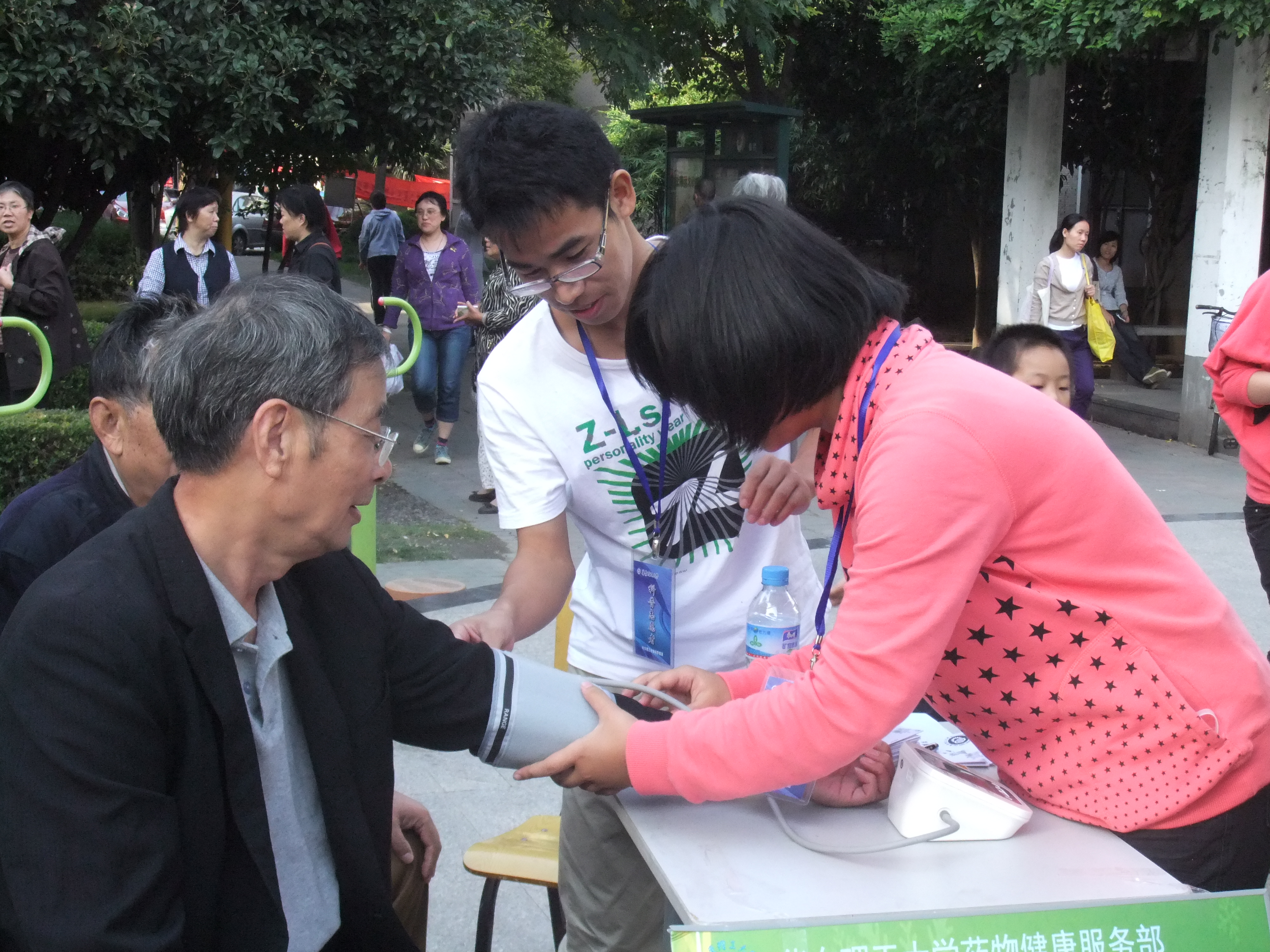 2011年10月15日下午,科学商店药物健康服务部联合大众化学服务部的志愿者,在徐汇区兴荣苑住宅小区开展了药物健康知识宣传活动,并免费为居民测量血压。
