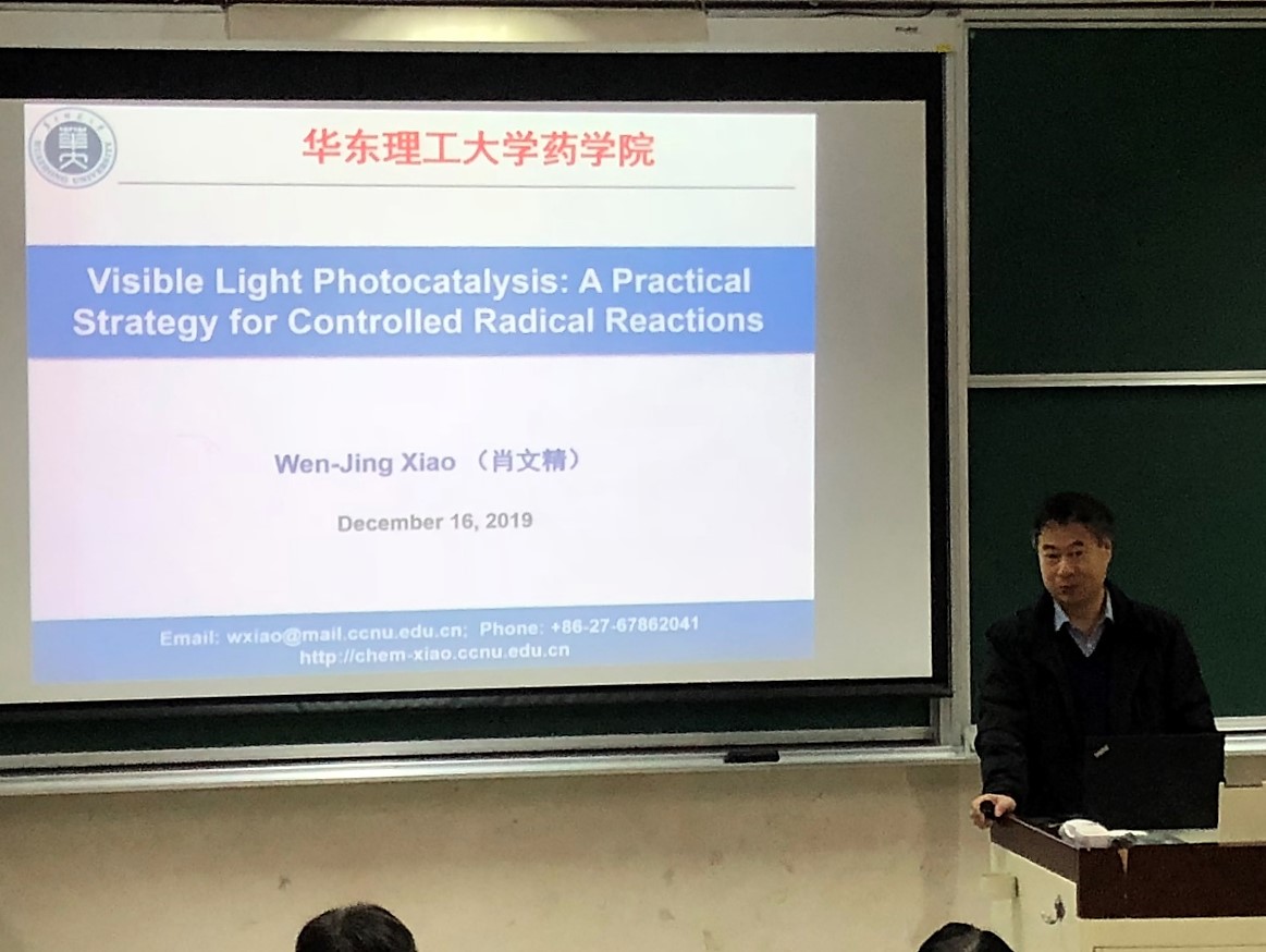 肖文精的主要研究兴趣是设计并发展新试剂、新催化体系和新反应,包括可见光驱动的光氧化还原催化的可控自由基反应、叶立德化学、手性配体和催化剂设计合成。肖文精在报告中介绍了其课题组在光催化可控自由基反应中一系列出色的研究成果,包括可见光诱导的环加成反应、羰基化反应、氧化反应及近期发展的光催化不对称转化等。同时结合研究实例,向在场师生详细讲解了光氧化还原催化、原子转移以及能量转移等具体过程。报告内容丰富精彩,使大家受益匪浅。在报告结束之后,肖文精还与在座师生进行了热烈的互动交流。