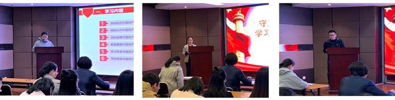 药物化工所研究生第一支部书记方宏龙分别发言。章飞芳结合本支部教工党员的学科特点,从学习内容和学习方式等方面介绍了支部年度党史学习教育工作计划,表示要将党史学习教育与人才培养、教学科研和社会服务紧密结合,激发党员教师守初心、担使命的责任感,积极为学校“十四五”发展贡献力量;方宏龙结合本支部与朱家角镇两个党支部合作共建的经验和党史学习教育的要求,将支部党史学习教育计划与大家进行分享,并表示带领支部同学一起学习党史、领悟思想,把握好这次武装头脑、指导实践的大好机会,认真完成各项党史学习教育工作要求,进一步促进学生党员提高党性意识,努力成才,将来更好服务祖国和人民。