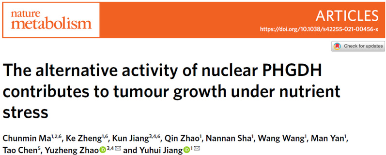 赵玉政教授团队与上海交通大学医学院附属仁济医院蒋玉辉研究员团队合作研究,深入解析了营养缺失条件下PHGDH通过核易位以及酶活转变调控细胞核NAD+和肿瘤细胞生长的分子机制。该研究成果以“The alternative activity of nuclear PHGDH contributes to tumor growth under nutrient stress”为题,在线发表在国际权威学术期刊《自然-代谢》(Nature Metabolism, 2021, )上。