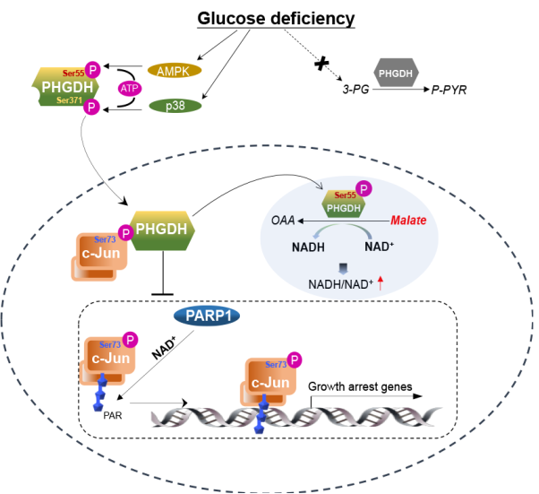 在临床胰腺癌样本中,PHGDH Ser371和Ser55磷酸化水平分别与p38和AMPK激酶活性呈正相关。在生理功能方面,营养应激下细胞核内的PHGDH通过其介导苹果酸氧化催化功能调控c-Jun转录活性从而维持了肿瘤细胞生长和肿瘤发展。此研究阐明了PHGDH非典型代谢活性调控肿瘤生长的分子机制,并阐释了其酶活的改变在肿瘤发生中的功能意义,这将为肿瘤治疗新策略的开发提供新思路。