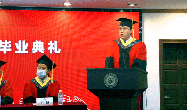 药剂182班刘宾代表本科毕业生发言。他感谢学校提供的全面细致帮助和优质平台,老师和学长学姐的悉心指导和建议,他如今带着母校及恩师的谆谆教导,加入 happy漫画