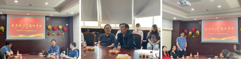 ,获得博士学位)回忆了师从刘教授的经历并表达了对恩师的感谢。座谈会气氛热烈、温馨感人,大家共同回忆了多年来工作中的快乐时光和点点滴滴。最后,参加仪式人员集体合影留念,光荣退休仪式在温馨、热烈的氛围中结束。