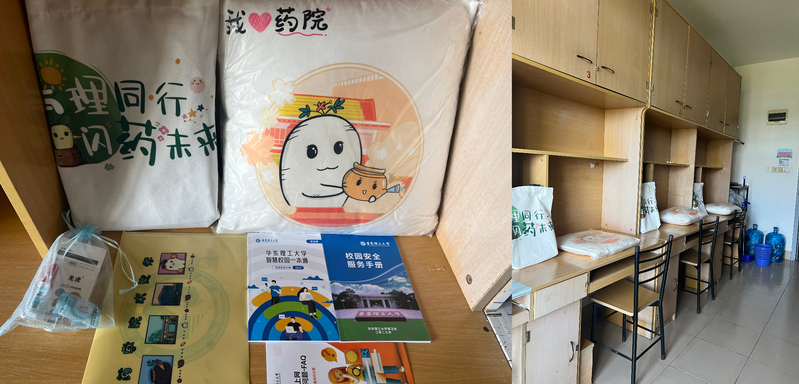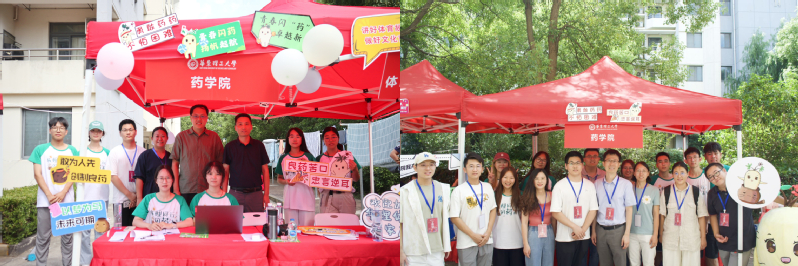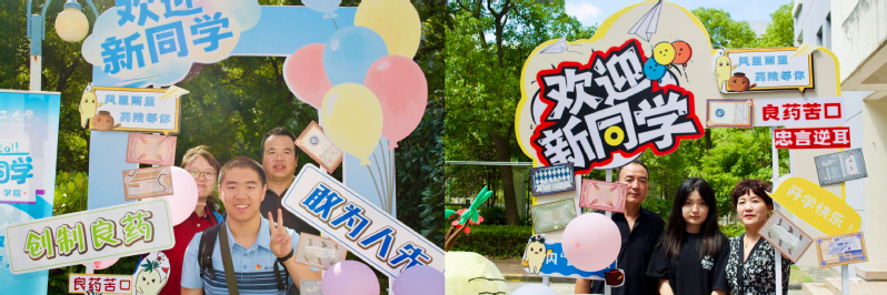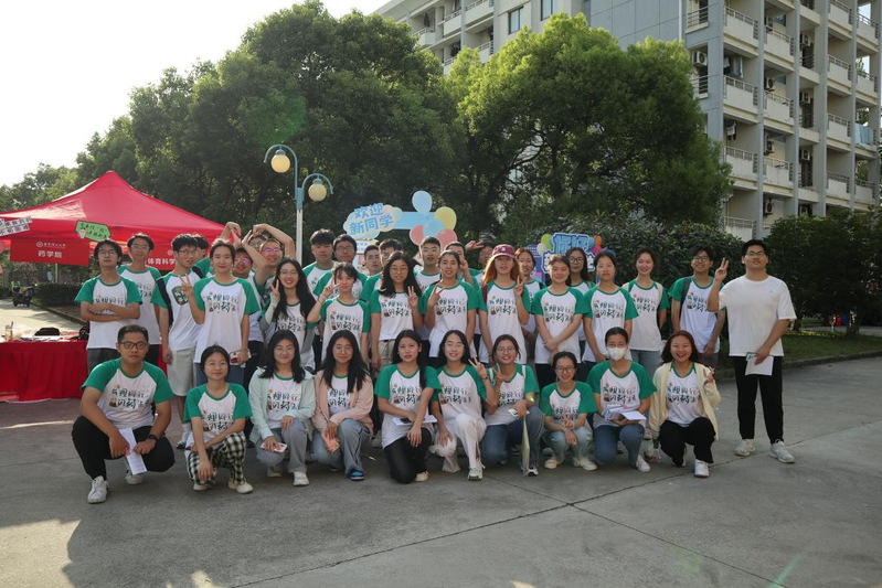 友爱互助的良好风貌。在报到点,新生跟“药药”合照打卡,留下在华理的第一张照片。