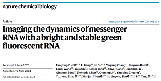 、生物反应器工程国家重点实验室、光遗传学与合成生物学交叉学科研究中心杨弋、朱麟勇、陈显军教授组成的研究团队在活细胞RNA成像技术研究中取得突破性进展,在国际著名学术期刊《自然—化学生物学》(Nature Chemical Biology)以长篇论文(article)形式在线发表题为“Imaging the dynamics of messenger RNA with a bright and stable green fluorescent RNA”的研究论文。