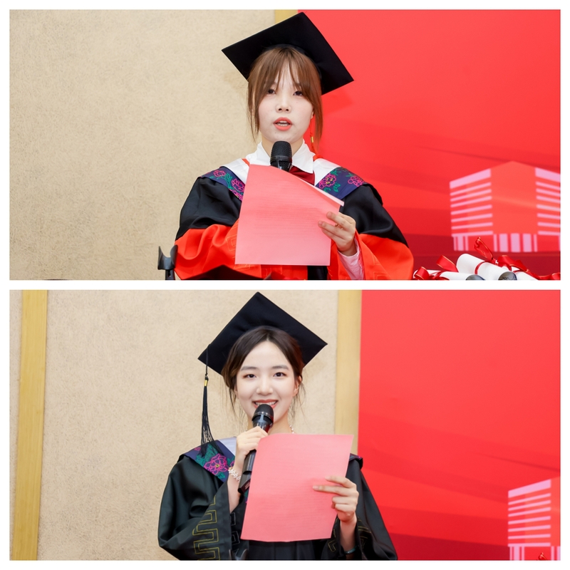 2024届博士研究生汪祎梦、本科生潘诗祺作为毕业生代表发言。汪祎梦同学分享了自己科研探索中的点点滴滴,表达了对母校深深的眷恋与感激之情。未来将继续秉承 happy漫画