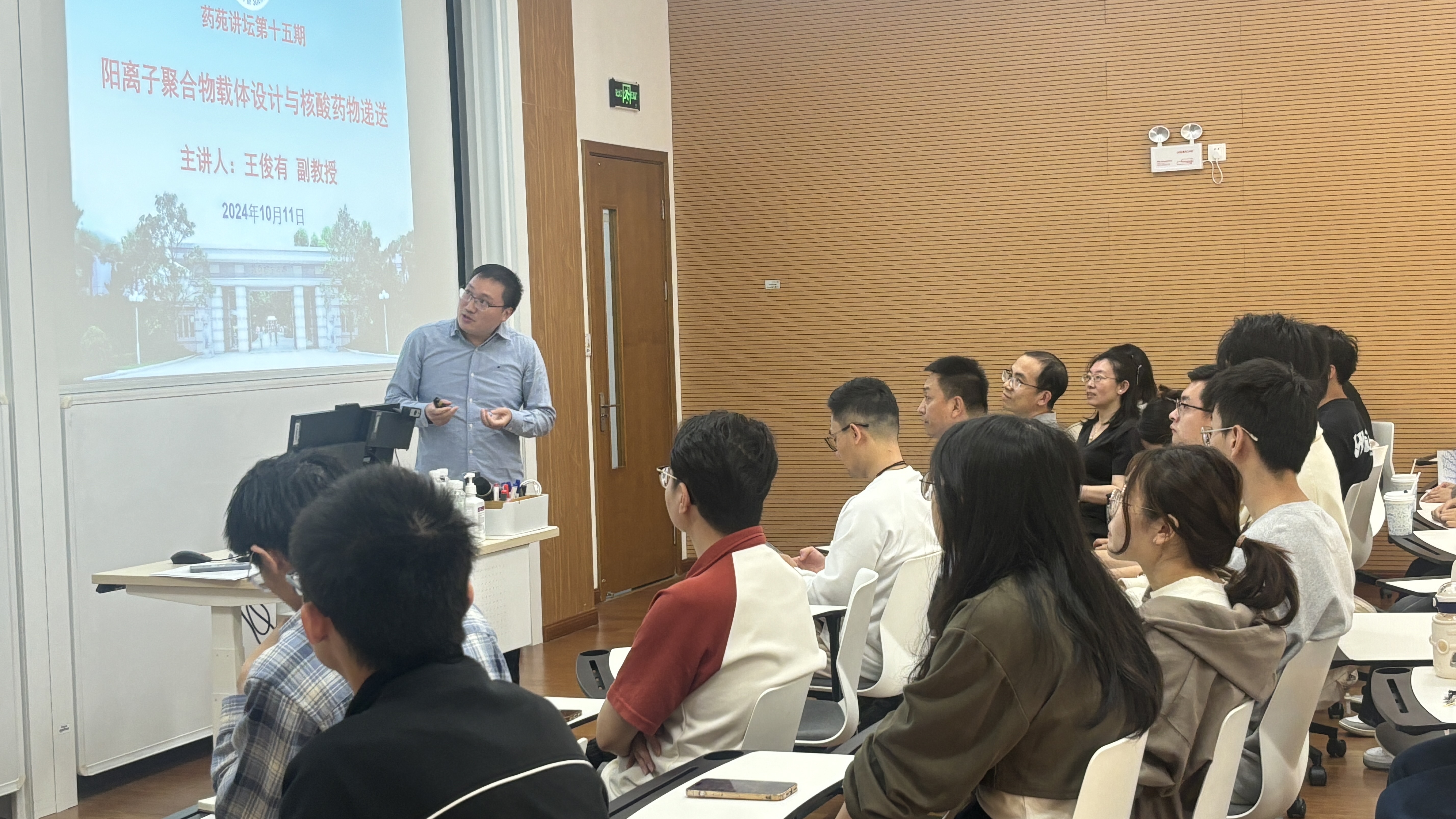 现场交流环节,王俊有与现场师生进行了互动问答,解答了关于纳米凝胶递送优势,靶向性如何实现等问题,并展开了激烈的讨论。本次学术报告在促进学科融合和跨学科合作,推动阳离子聚合物载体在肿瘤和骨质疏松等疾病治疗领域中的应用等方面具有重要意义。
