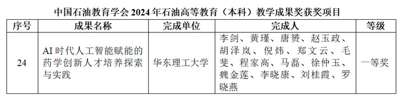 近日,中国石油教育学会公布了2024年石油高等教育教学成果奖获奖名单。由我院李剑教授等人完成的《AI时代人工智能赋能的药学创新人才培养探索与实践》获评石油高等教育(本科生)教学成果奖一等奖。该奖项实现了 happy漫画