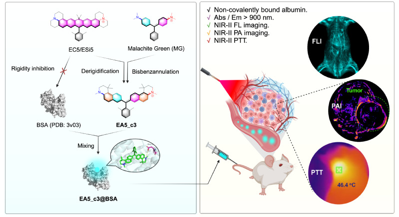 针对上述问题,研究团队以前期创制的具有高亮度、刚性化特点的深近红外EC系列染料为基础,通过去除刚性桥连基团,设计并合成了具有‘螺旋桨构型’的深近红外三芳基甲烷衍生物(EA5系列染料)。该系列染料母体具有键旋转自由度,在水溶液中荧光亮度较低(Ф< 0.1)。有趣的是,它们与牛血清蛋白(BSA)有极高的亲和性(结合常数 > 5.0×105 M-1)。在BSA的结合口袋中,EA5的结构自由度受限,荧光大幅增强26倍,同时由于蛋白空腔的空间屏蔽效应,EA5的稳定性也得到了大幅度提升。