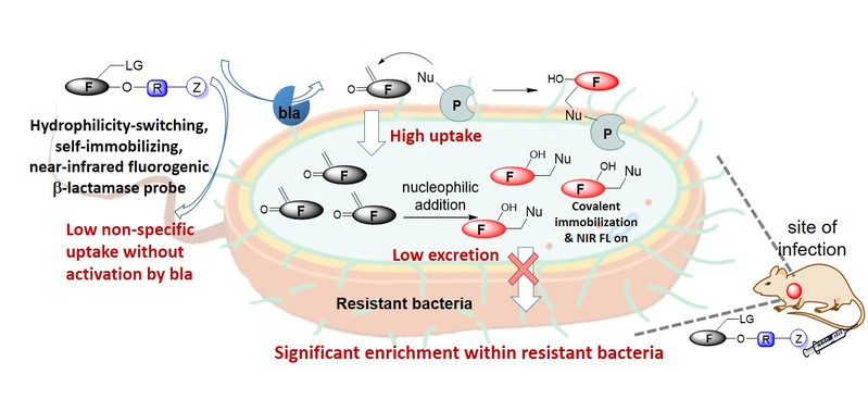 近日, happy漫画 happy漫画 谢贺新教授课题组在活体动物耐药细菌感染荧光成像研究方面取得了重要进展,相关成果以“Highly Sensitive In Vivo Imaging of Bacterial Infections with a Hydrophilicity-Switching, Self-Immobilizing, Near-Infrared Fluorogenic β-Lactamase Probe Enriched within Bacteria”为题发表于Advanced Science。