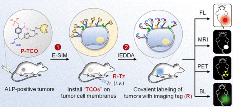 此外,谢贺新教授课题组与南京大学叶德举教授团队、江苏省原子医学研究所林建国研究员团队合作,在预靶向多模态活体动物肿瘤成像取得最新进展,相关成果以“Pretargeted Multimodal Tumor Imaging by Enzymatic Self-Immobilization Labeling and Bioorthogonal Reaction”为题发表在Journal of the American Chemical Society。该研究以研究团队前期发展的碱性磷酸酶自锚定探针(Chem. Eur. J. 2019, 25, 13994)为预靶向基团,通过亚甲基苯醌中间体的形成将反式环辛烯(TCO)选择性共价标记在活体动物肿瘤细胞膜上,进而通过快速的生物正交反应,将含有四嗪的各种信号报告基团(如荧光染料、磁纳米粒子、放射性核素、生物发光蛋白等)选择性富集在肿瘤细胞中,从而实现对活体小鼠肿瘤的高灵敏荧光、核磁共振、正电子发射断层及生物发光等多模态成像。南京大学博士研究生缪银杏、副研究员王宇琦、 happy漫画 博士研究生陈叶锋为论文共同第一作者,谢贺新、林建国和叶德举为论文共同通讯作者。