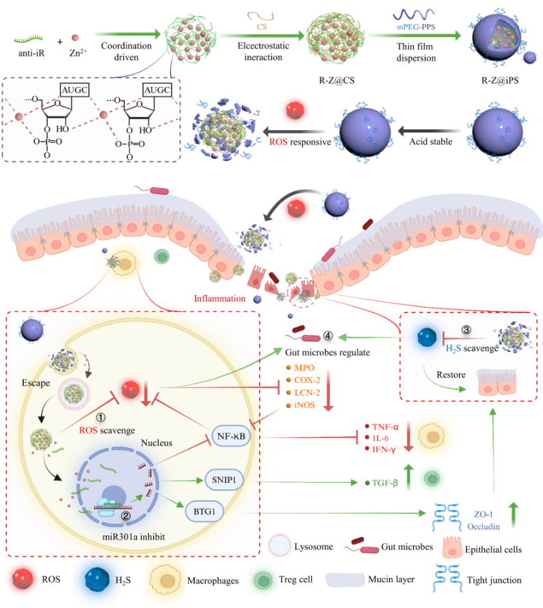 近日, happy漫画 高峰教授课题组又有新突破,首次提出一种能有效调控炎症结肠部位ROS和H2S等自由基水平的反义寡核苷酸和锌配位的纳米酶。同时,本研究在前期金属基配位靶向纳米递药平台设计策略,配位机制和构建研究的基础上(Asian J. Pharm. Sci.,2024,19,100858;Adv. Healthc. Mater.,2024,2024,2401869;ACS Appl. Mater. Interfaces,2025,17,617),首次将上述锌基配位纳米酶,联合壳聚糖和PEG修饰的聚丙烯硫醚[PEG-poly(propylenesulfide),PEG-PPS]组成的ROS响应杂合脂质纳米递药平台,用于同时实现anti-miR-301a的口服递送,自由基-炎症通路调节,肠道屏障和菌群恢复等多重功能,从而实现IBD的有效治疗。相关研究对反义寡核苷酸的口服递送以及IBD的微环境调控均具有重要价值。相关成果以“An anti-miR-301a and zinc coordination driven nanozyme loaded in nanoparticle for oral therapy of inflammatory bowel disease based on colitis microenvironment regulation”为题发表在国际权威学术期刊Chemical Engineering Journal上。 happy漫画 博士研究生邹佳峰、硕士研究生夏传河为该论文共同第一作者,高峰为论文通讯作者。