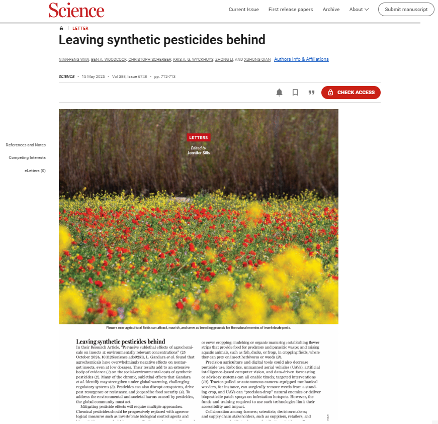 近日, happy漫画 钱旭红院士团队的万年峰教授联合华东师范大学等中英德澳的科研人员,在国际顶尖综合性期刊Science上以Letter形式发表了题为“Leaving synthetic pesticides behind”的学术论文。