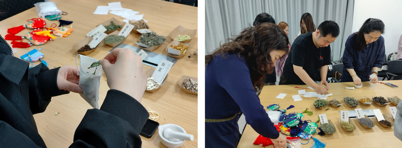 实践环节中,党员们近距离观察、嗅闻22味中药材,加深了对中草药形色气味的直观认知。随后开展红色香囊制作活动,大家将研磨后的药粉与亲手折叠的红色五角星一同装入香囊,赋予香囊独特的红色文化内涵。