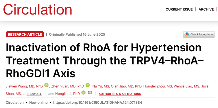 李洪林/王蕊教授团队在Circulation上发表了题为“Inactivation of RhoA for Hypertension Treatment Through the TRPV4-RhoA-RhoGDI1 Axis”的研究论文。该研究首次揭示了一种全新降压靶点——TRPV4-RhoA-RhoGDI1轴,并成功发现该靶点的首个小分子候选药物。