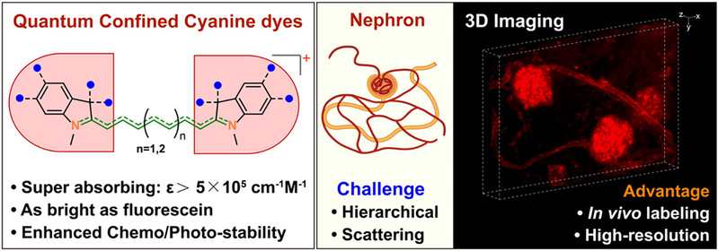 钱旭红院士、杨有军教授团队构建了基于“电场量子限域效应”的超吸收花菁染料。该研究工作提出了一种用于提升染料摩尔消光系数的理性设计方法,对Cy3/5/7/9四个系列的染料进行合理分子改造,成功构建一个摩尔消光系数高(亮度高)、稳定性好的花菁染料库,并成功实现小鼠肾脏组织高精度三维成像。相关成果以“Super-Absorbing Quantum-Confined Cyanine Dyes for Near-Infrared Confocal Imaging of Hierarchical Nephron Structures”为题发表在J. Am. Chem. Soc.(