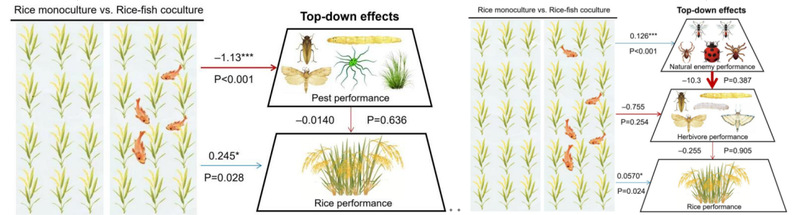 全球数据分析表明,与水稻单作相比,稻鱼共生使水稻产量平均提升12.5%,水稻增产因鱼的种类不同而不同(图2);与单一种植水稻相比,稻鱼共生可使产量提高12.5%,同时使无脊椎天敌(捕食者/寄生者)数量增加99.3%,并有效抑制害虫(减少24.1%)、病害(减少38.8%)和杂草(减少45.7%)(图2);就不同气候带、水稻类型和试验类型而言,温带控害与增产效果比热带的效果好,非有机稻田控害与增产效果比有机稻田的效果好,小区试验控害与增产效果比盆栽试验的效果好(图3);下行效应路径分析结果显示,在水稻-病虫草害二营养级互作系统中,稻鱼共生通过抑制有害生物来增产,在水稻-害虫-天敌三营养级互作系统中,稻鱼共生通过增加天敌数量来抑制害虫,进而实现间接增产效应(图4),将全球数据分成不同气候带、水稻类型和试验类型后,这种下行控制作用在有机与非有机系统、温带与热带地区均持续存在,即,稻鱼共生→促进天敌种群→抑制害虫→促进水稻生产力。