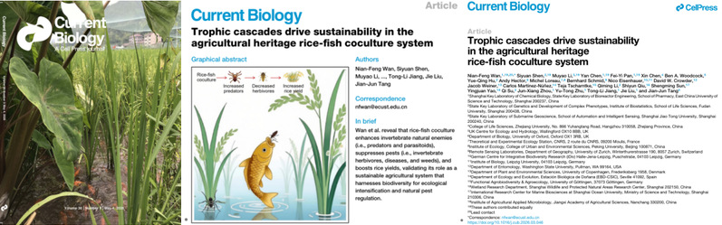 万年峰教授课题组,联合中、英、法、美、德、瑞士、丹麦、西班牙等全球科研人员,在国际生物学著名期刊Cell子刊—Current Biology上以封面文章形式发表了题为“Trophic cascades drive sustainabilityin the agricultural heritagerice-fish coculture system”研究性论文。该研究为具有数千年历史的稻鱼共生模式(全球重要农业文化遗产)提供了坚实的科学依据。研究整合了全球18个国家的实验数据,并在中国东部开展了长期田间定位与行为学实验,系统证实了这一古老农艺不仅能增产,更能通过生态调控机制控制病虫害,为生态农业转型与保障粮食安全开辟了科学路径。