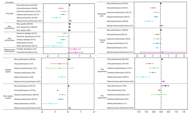 图3 稻鱼共生影响稻田营养级类群的响应效应值