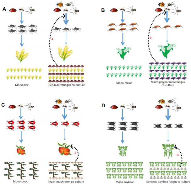 与作物多样性、作物与人类驯养动物共存的物种多样性相比,作物与食用菌共存的物种多样性(例如,葡萄园种灵芝、茶园种香菇、玉米间作蘑菇、水稻间作黑木耳),是保障食物安全和增加经济效益的重要技术。该技术在我国、巴西、埃及以及美国的一些地区,已被广泛采用。遗憾的是,学术界对该技术的控害机制知之甚少。针对当前研究空白,作者提出了两种假说:天敌假说(Natural enemy hypothesis)、作物抗性假说(Crop resistance hypothesis)(见图5)
