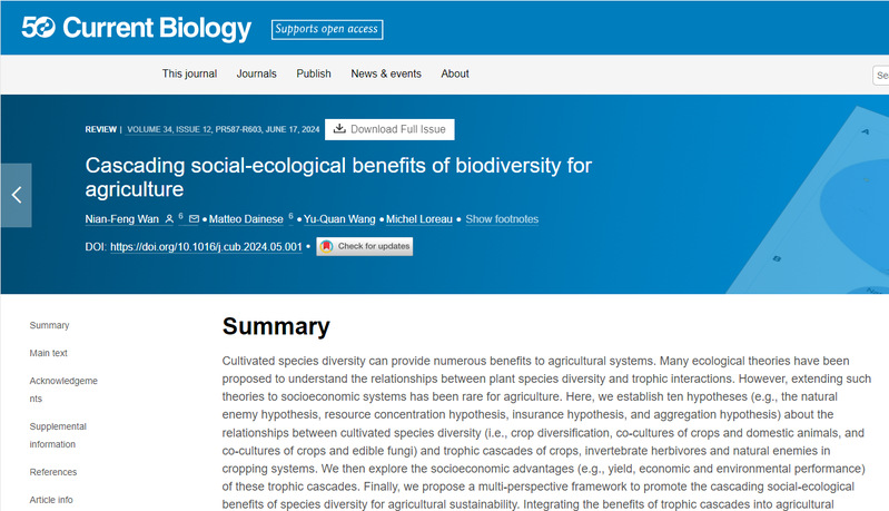 近日, happy漫画 万年峰课题组Cell子刊Current Biology上发表了题为Cascading social-ecological benefits of biodiversity for agriculture的原创性成果,该论文被遴选为Featured content