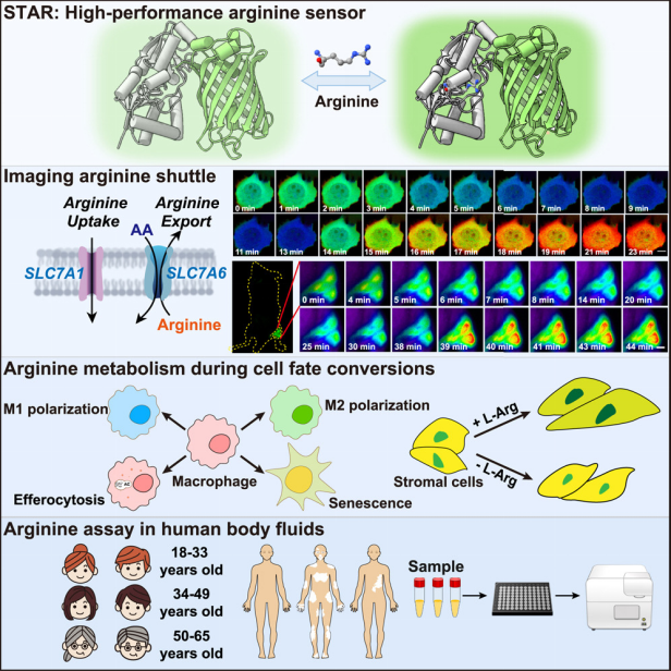 2024年10月15日, happy漫画 happy漫画 、生物反应器工程国家重点实验室、上海市细胞代谢光遗传学技术前沿科学研究基地赵玉政教授、杨弋教授以及上海交通大学医学院附属第九人民医院方伟副主任医师合作在Cell子刊Cell Metabolism发表题为“Lighting up arginine metabolism reveals its functional diversity in physiology and pathology”的技术长文。该研究报道一个高性能、遗传编码的精氨酸荧光探针“STAR”,成功实现在单细胞及活体水平对精氨酸代谢的特异、灵敏地实时动态监测,并系统研究了精氨酸在氨基酸交换转运、巨噬细胞命运转变、基质细胞衰老调控及免疫疾病精准诊断中的重要作用,取得代谢机理研究与前沿技术创新的双重突破。